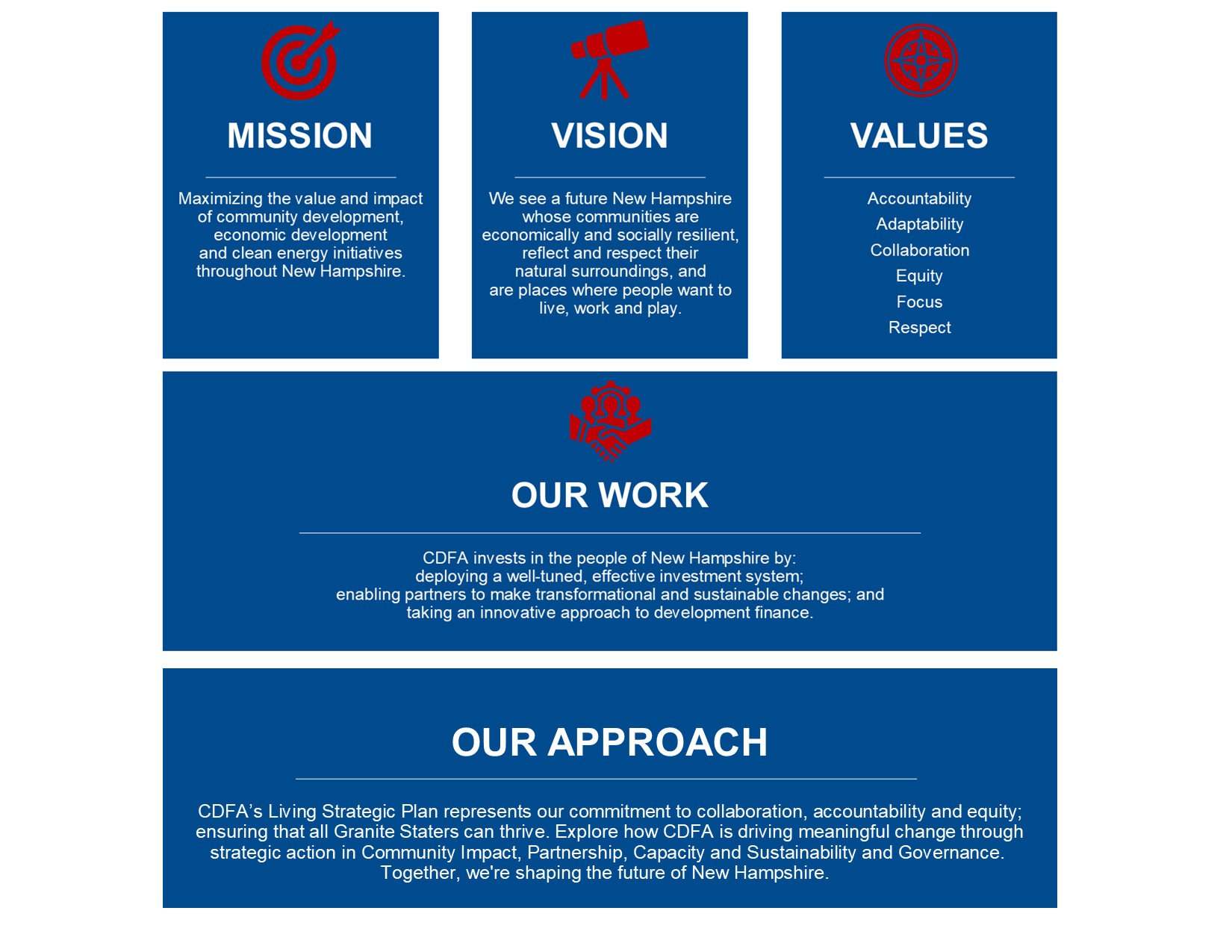 We invest in the people of New Hampshire by: deploying a well-tuned, effective investment system; enabling partners to make transformational and sustainable changes; and taking an innovative approach to development finance.